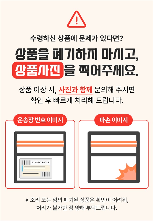 · 상품 불량 사유와 사진을 남겨 주시면 빠른 처리가 가능합니다.