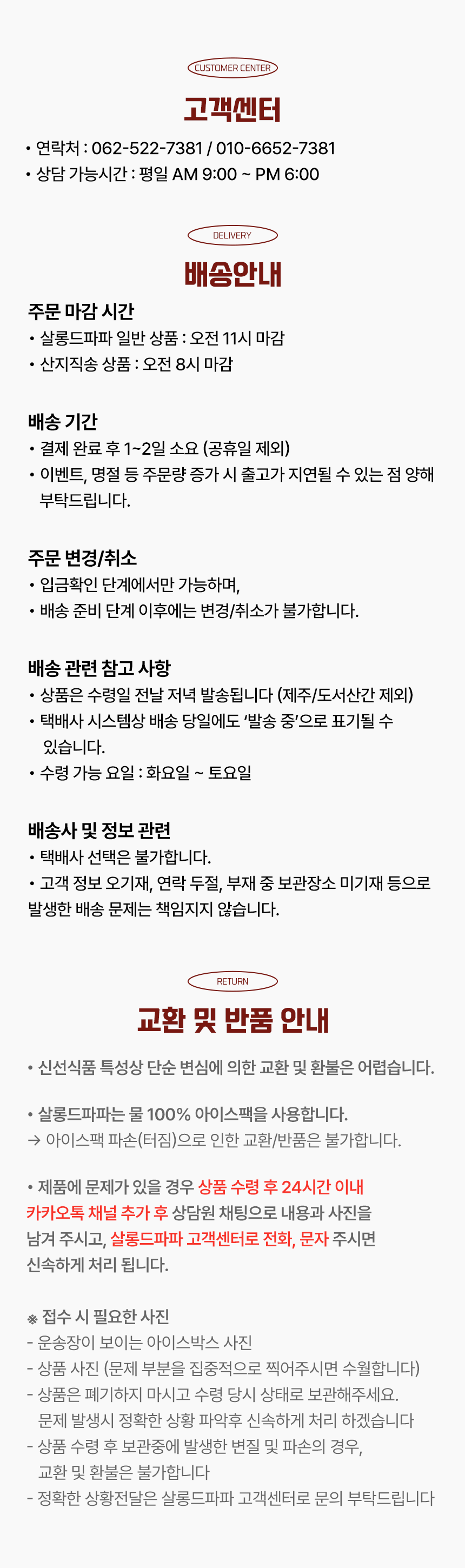 · 구매자가 배송지 주소를 잘못 기입한 경우, 반송/재발송 모두 택배비를 부담하셔야 합니다. (꼭 정확한 주소를 기입해 주세요)